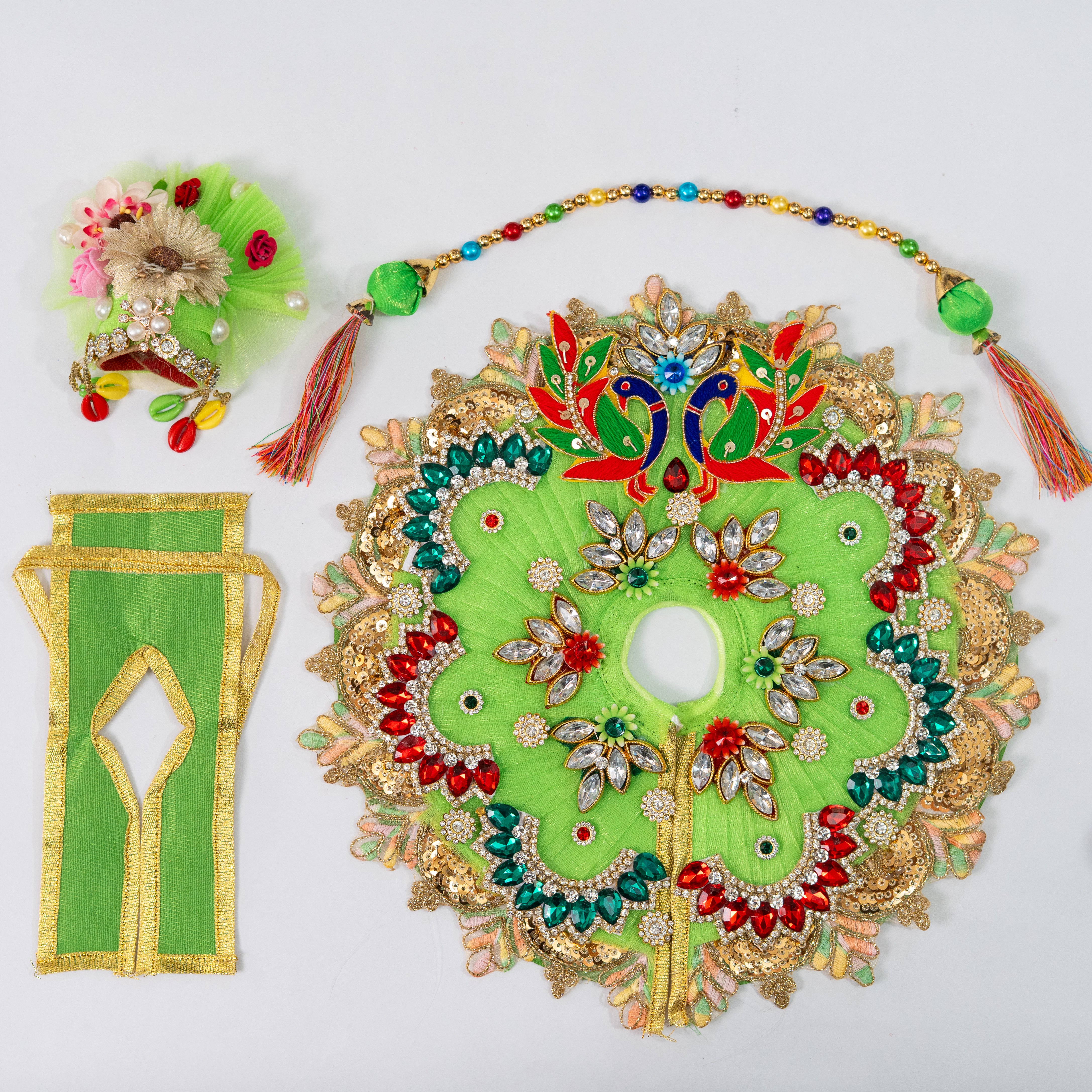 Bring the serene charm of Vrindavan right into your temple with this beautifully handcrafted Laddu Gopal Poshak. Inspired by the monsoon beauty– beloved in Krishna Leela – this outfit is a celebration of devotion and art.