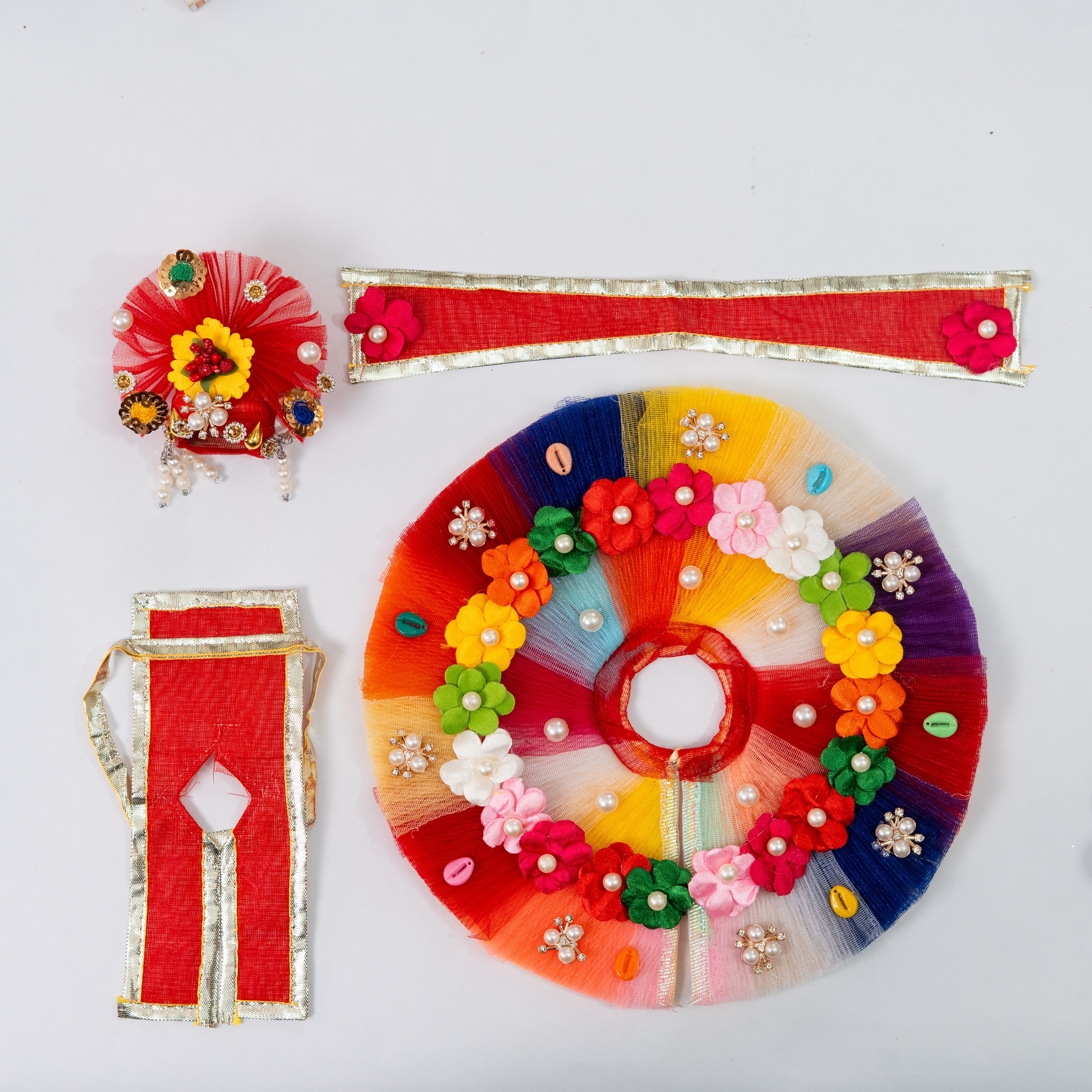 Let your Laddu Gopal sparkle in the Festive Spirit with our Multi Flower Dress, inspired by the playful colors and blooming joy of Vrindavan. With each flower, color, and stitch, this dress becomes a heartfelt offering to Kanha Ji’s love for celebration and divine mischief.