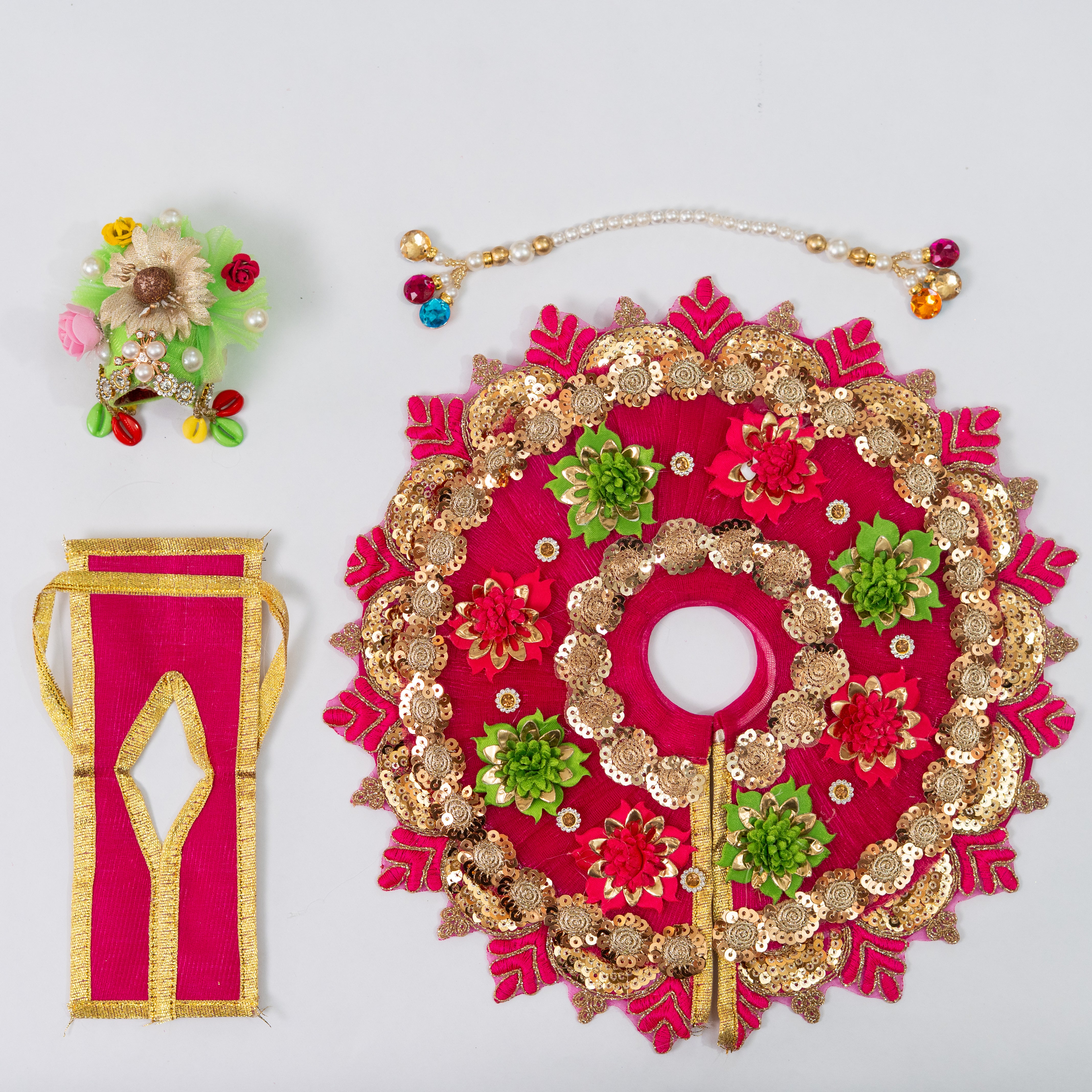 Wrap your Laddu Gopal in the rich elegance of Rani pink, a color that embodies royalty, love, and divine beauty. The Rani Flower Dress is inspired by Krishna’s enchanting presence and the delicate blossoms of Vrindavan, offering a look that’s both regal and radiant.