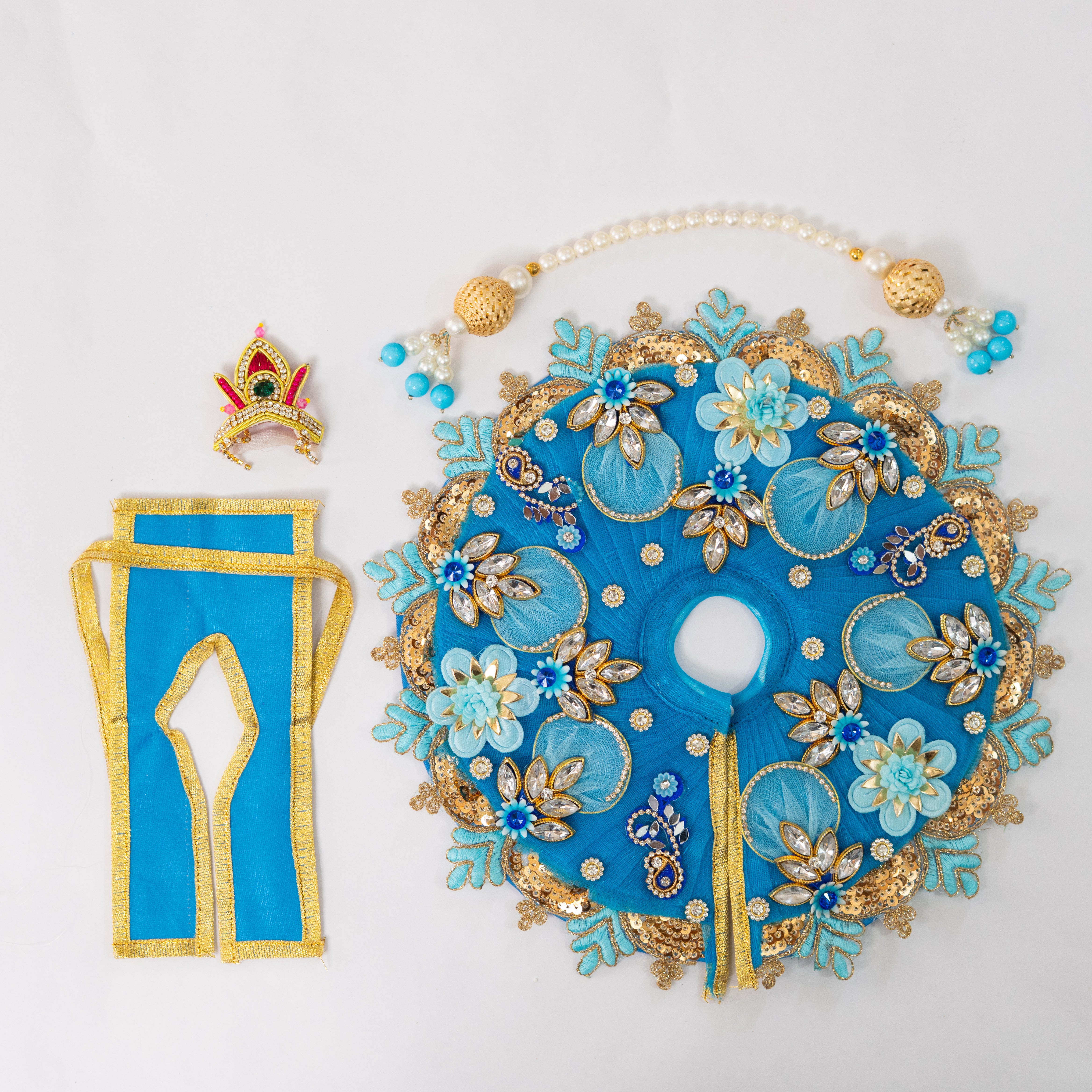 Inspired by the gentle sky over Vrindavan and the ever-blooming devotion of nature, the Sky Blue Flower Dress is a serene and graceful offering for your Laddu Gopal. This dress blends tranquil sky blue hues with hand-embroidered floral artistry, bringing peace, purity, and love to every darshan.