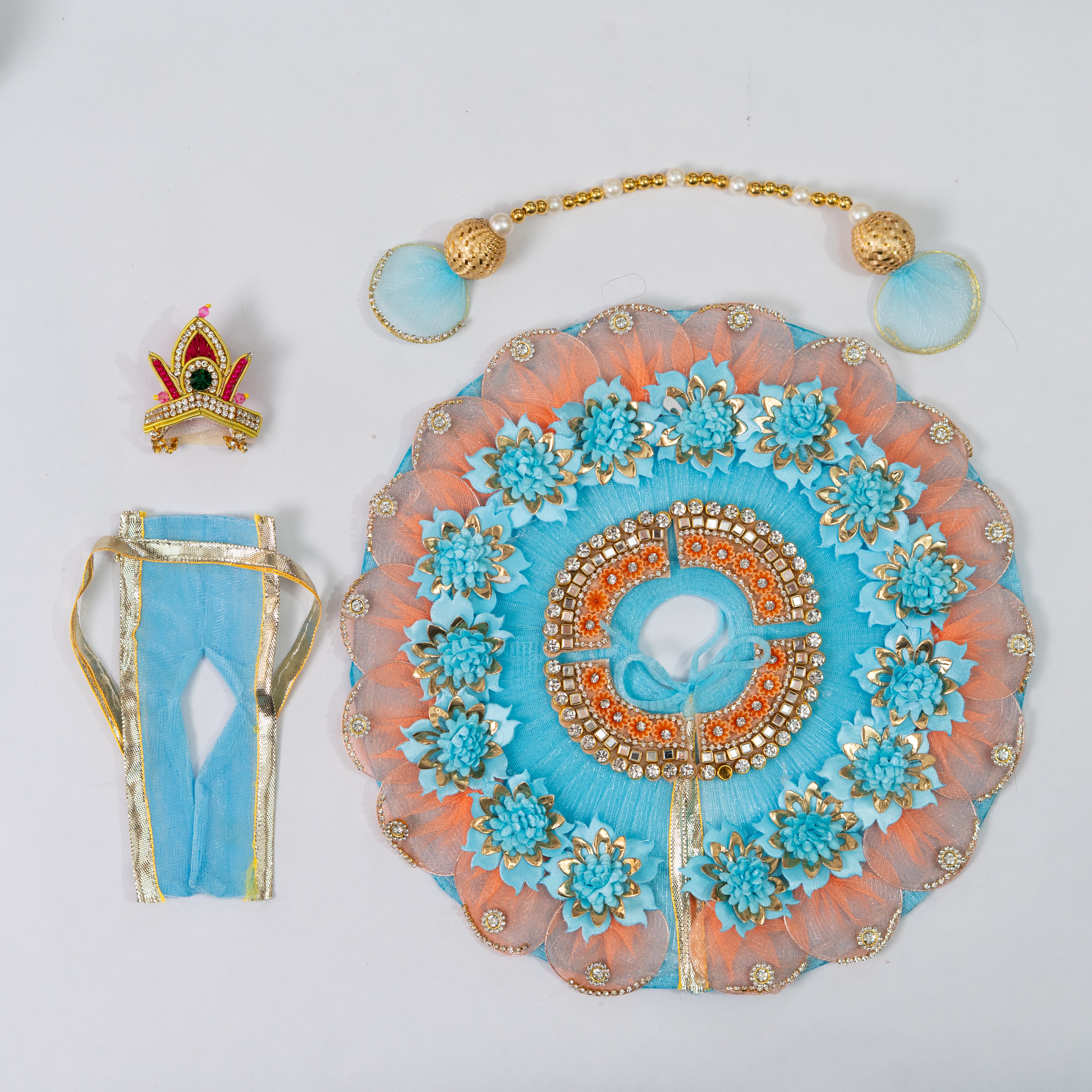 Let your Laddu Gopal shine in the soft hues of the sky and the sweetness of peach with this elegant Sky Blue Peach Ring Dress. Inspired by the tranquility of Krishna’s divine presence and the playful joy of Vrindavan, this outfit blends pastel beauty with devotional artistry.